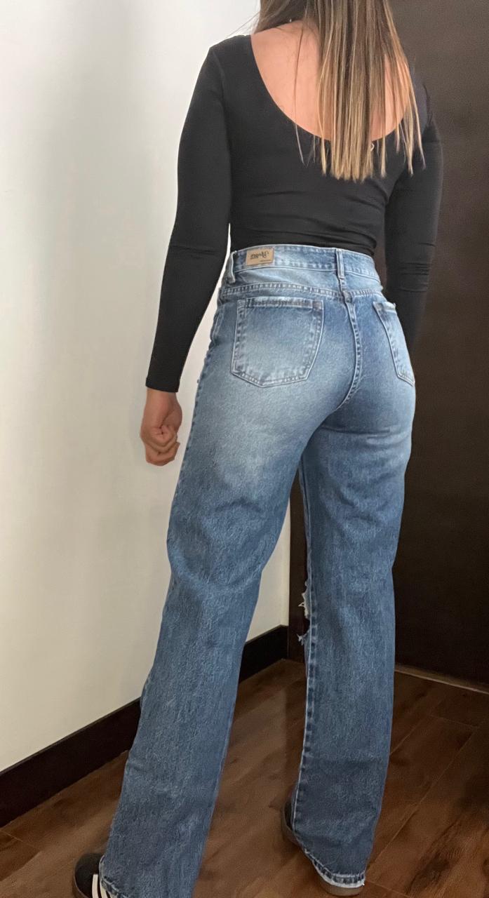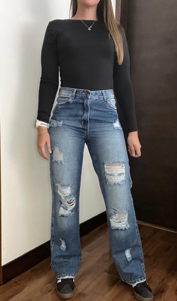 Ref: 0670 Jean bota recta, rígido, tiro medio, tono medio rotos cintura ajustada pierna holgada, diseño cinco bolsillos.