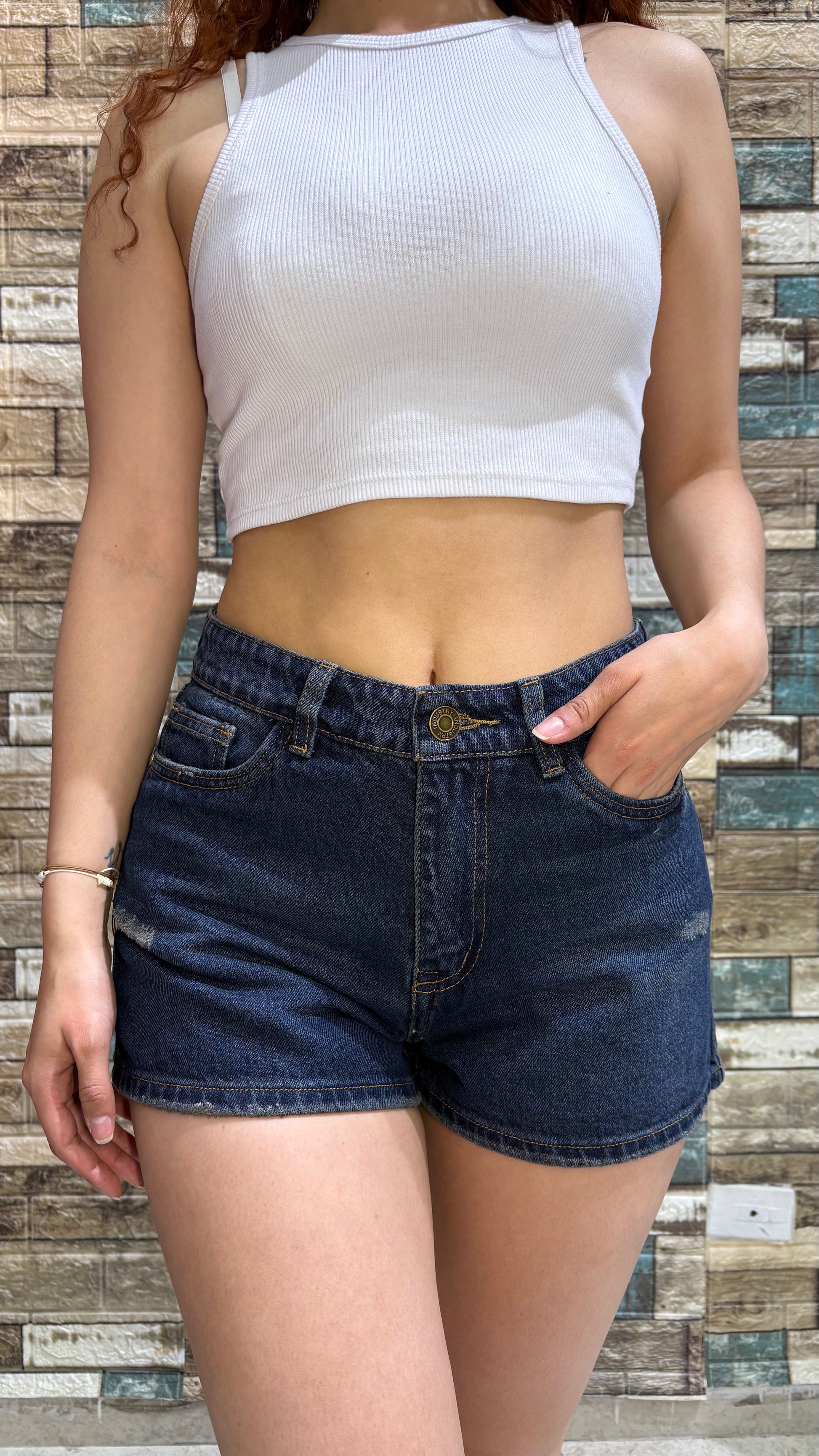 Ref: 9717 Short denim, tela rígida, detalles desgastados. Tiro alto, fit ajustado.
